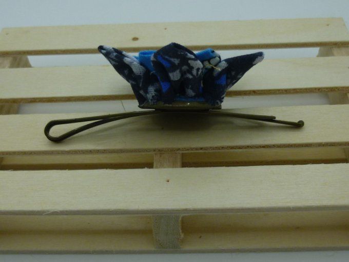 Fleur réalisée à la main avec du tissu aux couleurs assorties dans les tons de bleu et montée sur une barrette en métal.