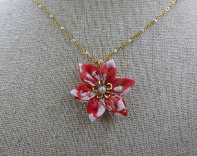 Ajoutez du pep's à votre tenue avec cette fleur fine et lumineuse ! Avec son tissu rouge et blanc, ce bijou est réalisé à la main et est monté sur une fine chaîne en acier inoxydable dorée avec des petites perles d'émail blanc.